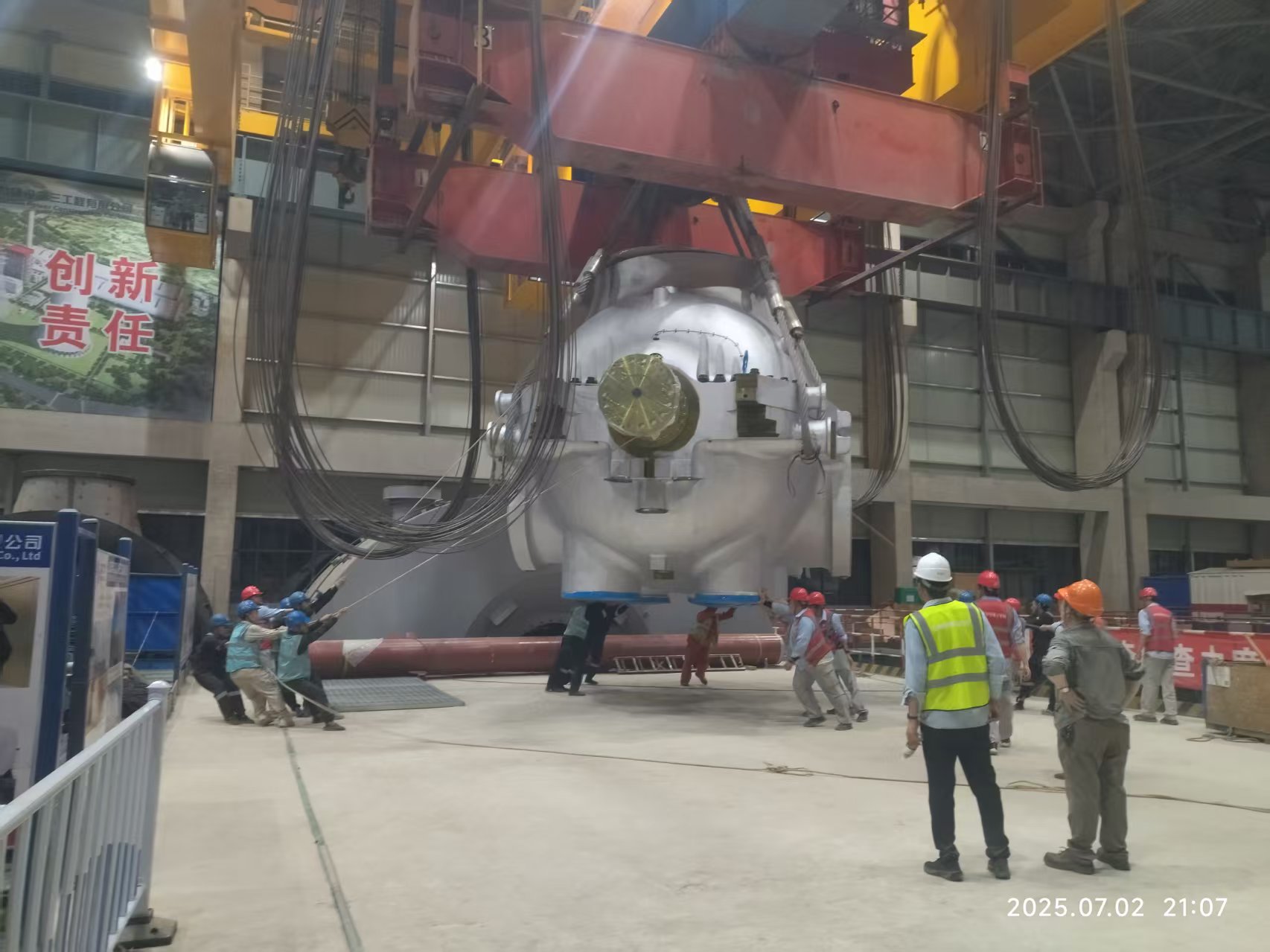 在酷暑高溫的嚴(yán)峻考驗下,國能長源漢川電廠四期2×1000兆瓦擴(kuò)建工程迎來關(guān)鍵節(jié)點。7月2日,經(jīng)過精心組織與周密部署,項目8號機組的兩大核心設(shè)備——汽輪機中壓缸與發(fā)電機定子順利完成吊裝就位,這標(biāo)志著項目建設(shè)取得重大階段性成果。 國能長源漢川四期2×1000兆瓦擴(kuò)建工程廠址位于湖北省漢川市新河鎮(zhèn),是湖北省“十四五”重點建設(shè)項目,規(guī)劃擴(kuò)建2×1000兆瓦超超臨界燃煤機組,同期建設(shè)煙氣脫硫、脫硝裝置。 本次吊裝的汽輪機中壓缸、發(fā)電機定子的吊裝重量分別為275噸、405噸,重量大,吊裝技術(shù)復(fù)雜,當(dāng)前又正值盛夏高溫天氣,對設(shè)備狀態(tài)、人員狀態(tài)及施工安全構(gòu)成多重挑戰(zhàn)。為了確保順利吊裝就位,項目監(jiān)理部充分發(fā)揮核心監(jiān)督與協(xié)調(diào)作用,審核并優(yōu)化專項施工方案,針對高溫環(huán)境下的人員防暑、機械性能等風(fēng)險點制定專項預(yù)案,組織對行車吊裝系統(tǒng)進(jìn)行了全面的安全與技術(shù)措施聯(lián)合檢查,深入排查隱患等,在各參建方的共同努力下,有序完成了汽輪機中壓缸和發(fā)電機定子的吊裝就位,向著項目如期投產(chǎn)的目標(biāo)邁出了關(guān)鍵一步。 該項目作為華中電網(wǎng)西電東送、北電南送重要電源支撐點,建成后,將進(jìn)一步增強西電東送通道上的電源支撐,對優(yōu)化區(qū)域電源結(jié)構(gòu),改善電網(wǎng)運行條件,促進(jìn)經(jīng)濟(jì)快速發(fā)展具有十分重要的意義。 |